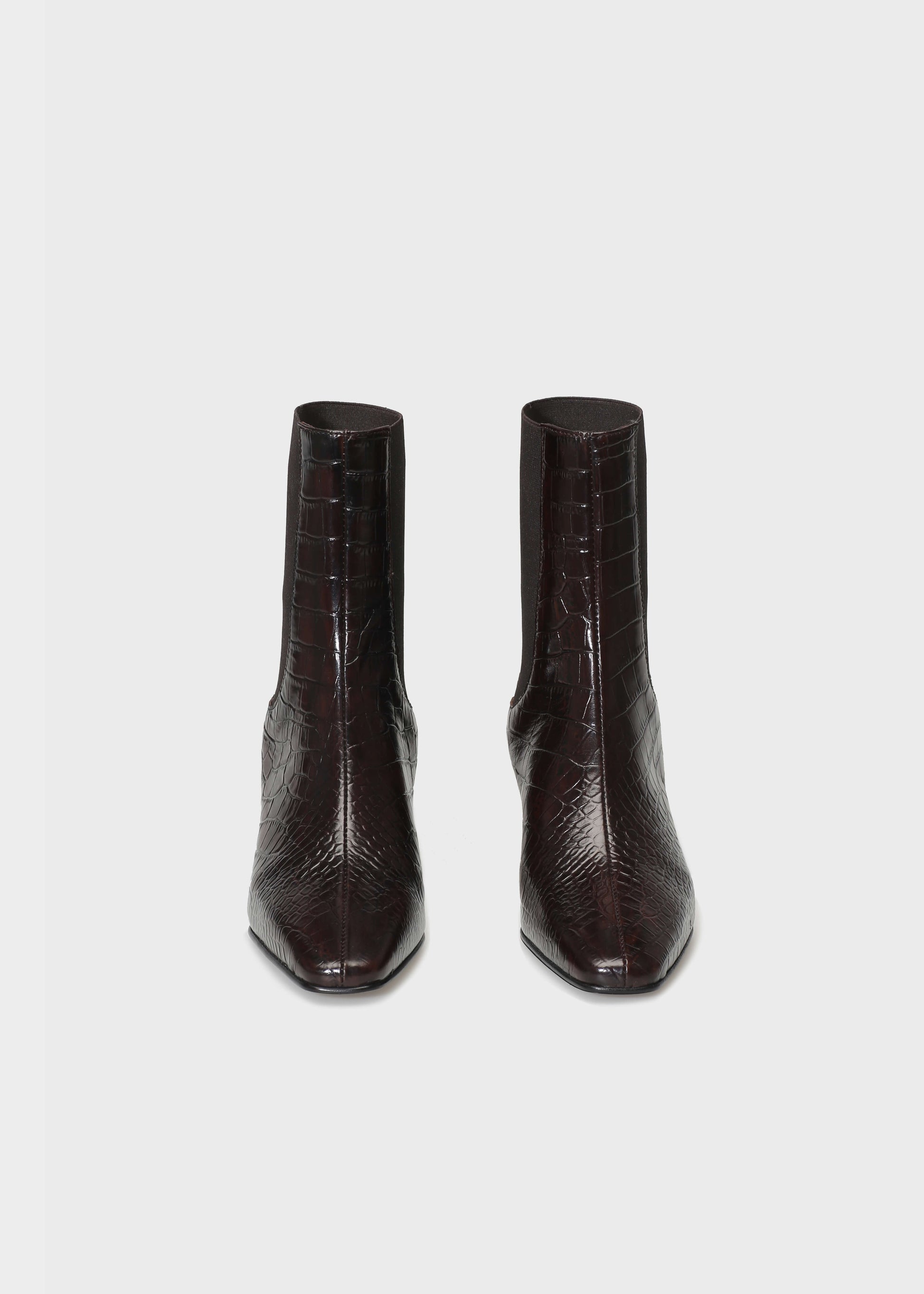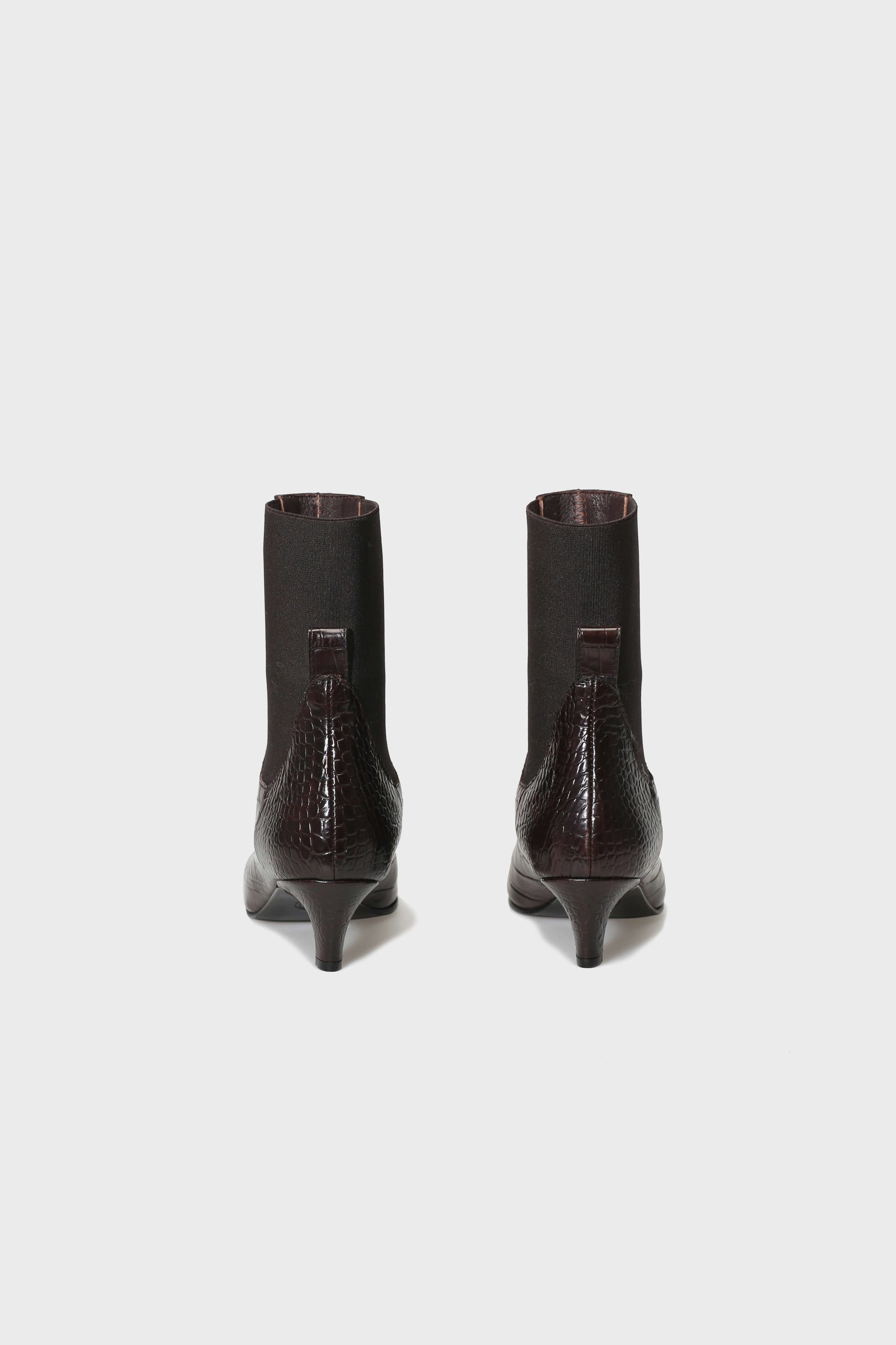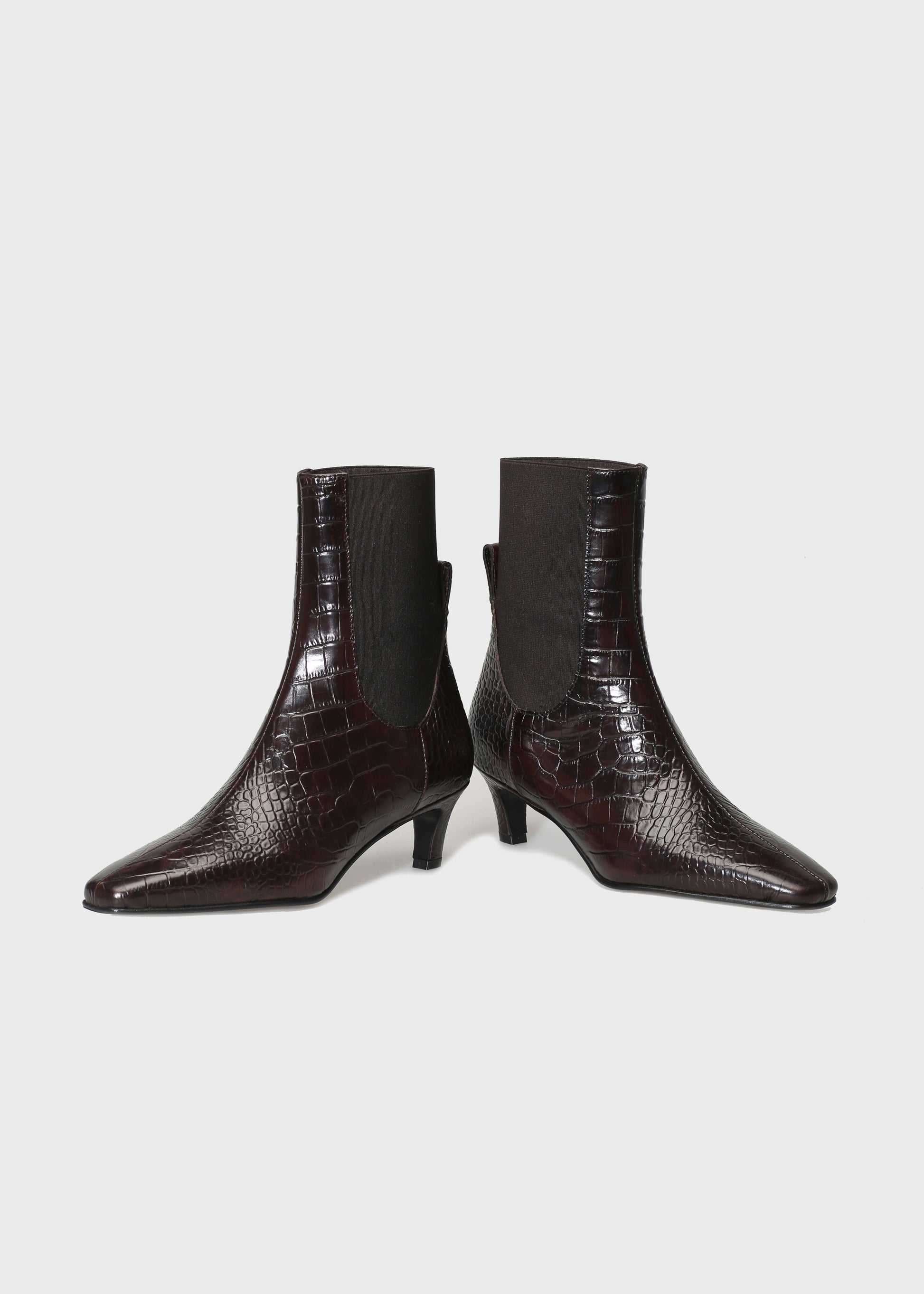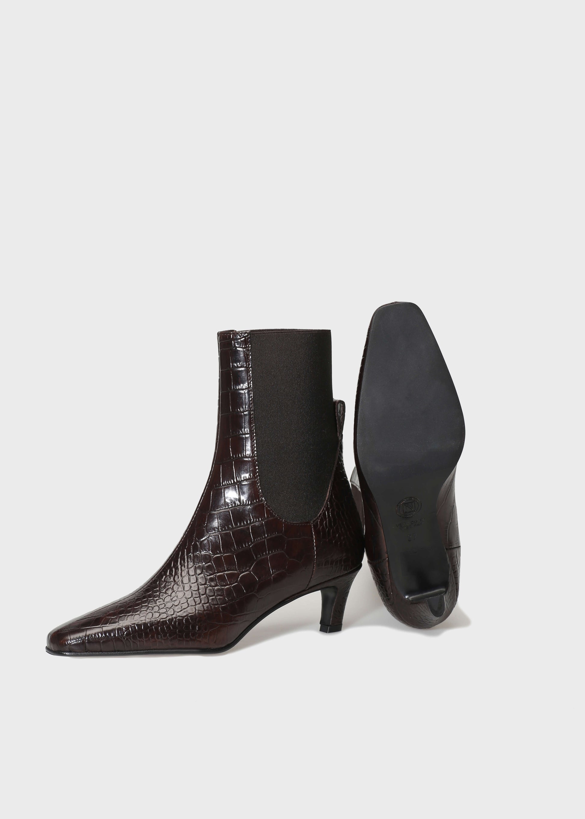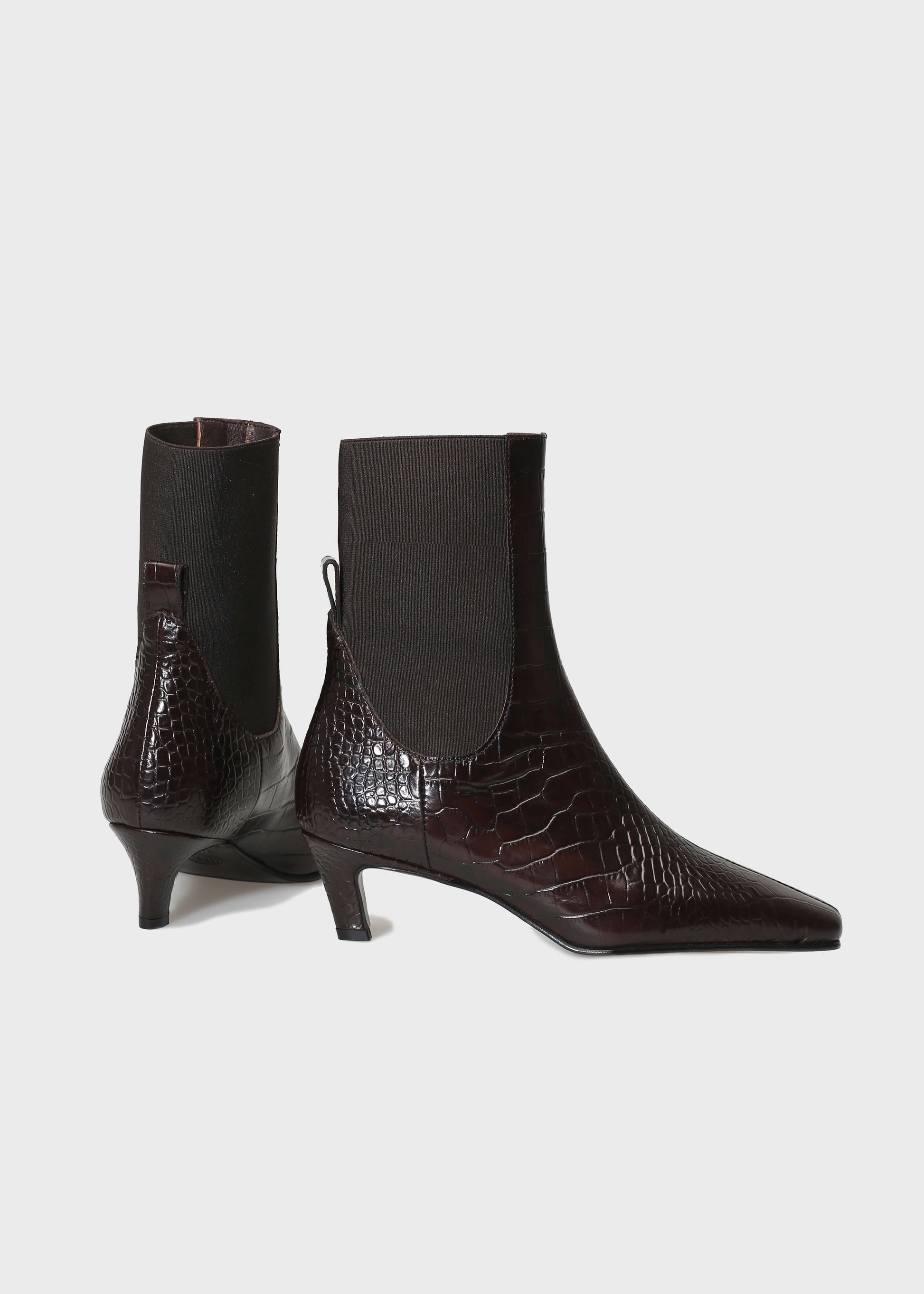 Our elegant dark brown extra shiny cocco ankle boots, Camilla, feature a modern, minimalist design with a soft pointed toe and a sleek, low kitten heel for a refined look. The boots are crafted from smooth leather and have a contrasting stretch along the ankle for added comfort and flexibility. With their versatile silhouette and timeless appeal, Camilla are perfect for complementing both tailored outfits and casual ensembles.