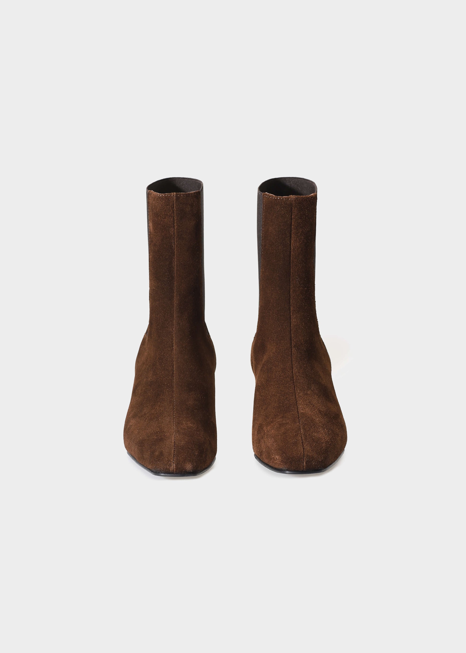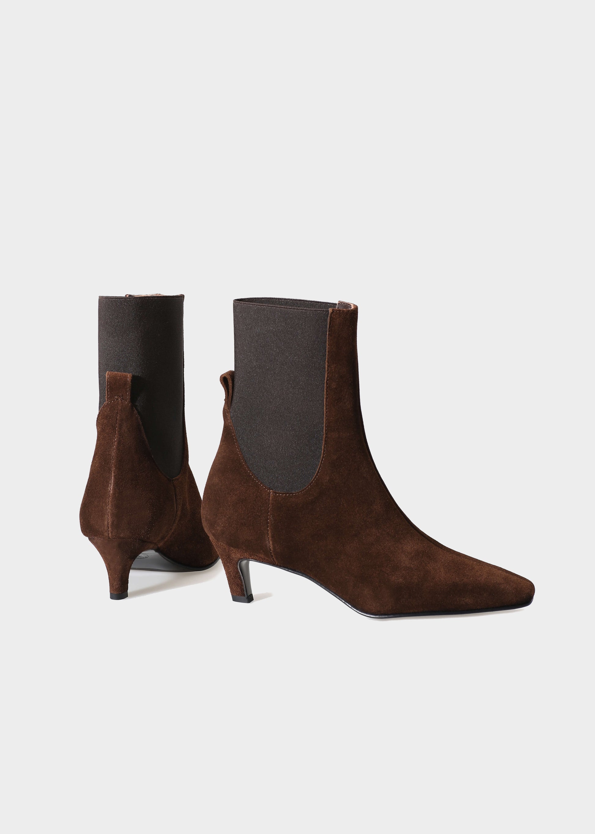 Our elegant ankle boots, Camilla, feature a modern, minimalist design with a pointed toe and a sleek, low kitten heel for a refined look. The boots are crafted from velour leather and have a contrasting stretch along the ankle for added comfort and flexibility. With their versatile silhouette and timeless appeal, Camilla are perfect for complementing both tailored outfits and casual ensembles.