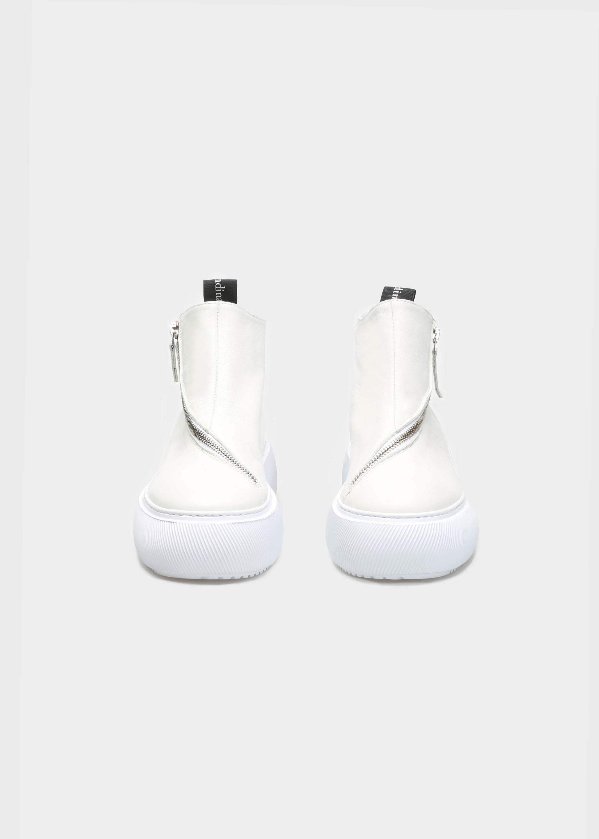 HEDDA in a casual trainer version, featuring a lightweight Eva outsole directly stitched to a full leather upper. This one in Capricorno leather in classic white. Leather lining, ensuring durability and comfort. Featuring an iconic metal zip that wraps around the shoe. With a padded removable insole providing great comfort throughout the day.
