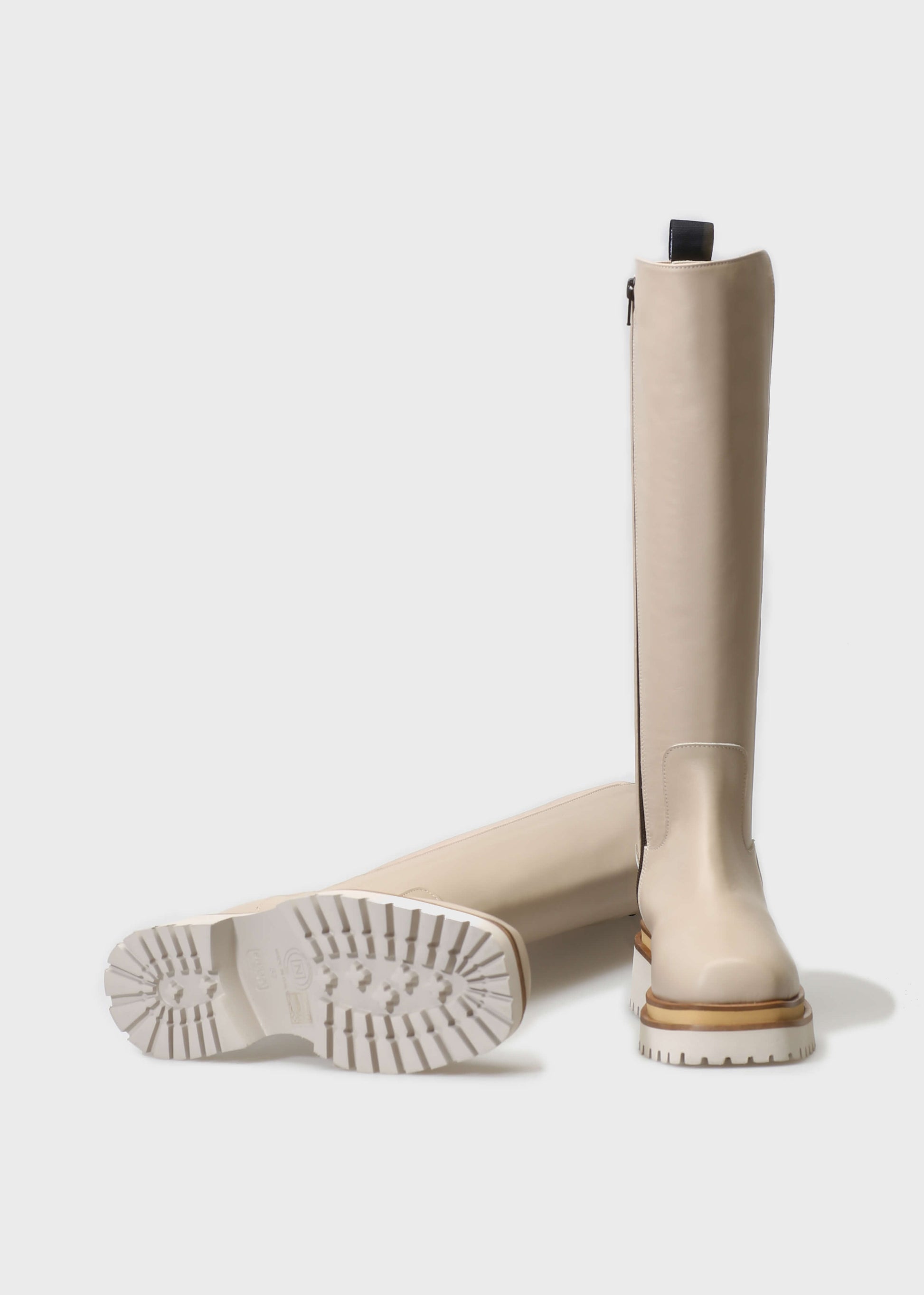 Knee-high boots Vilma in beige leather features high shafts with elastic side panels and a side zip for an easy wear. The sturdy, lugged sole adds traction. The perfect tall boot for those looking to combine style and functionality this season.