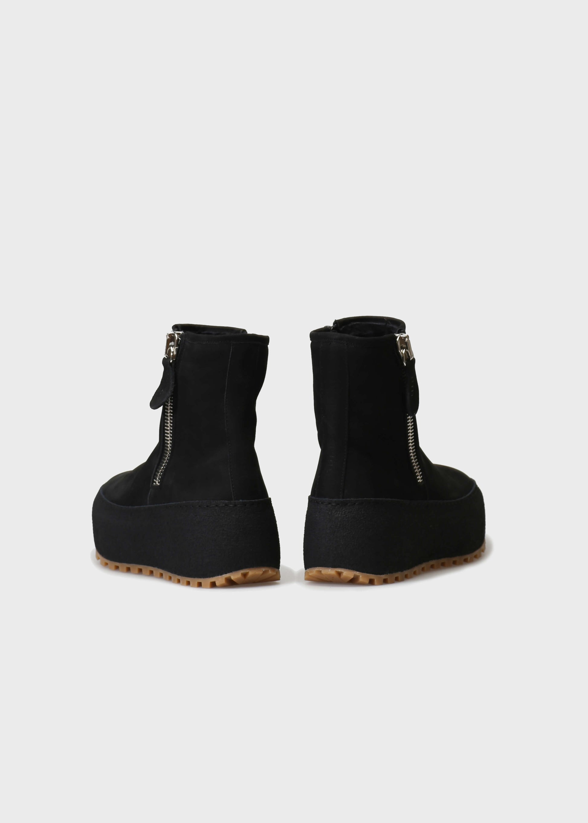 These boots feature a robust, isolated sole that keeps you warm in chilly conditions. A large, detailed silver zipper on the outer side adds both functionality and a stylish flair. The outsole is crafted from rubber and leather. The form-padded removable inner sole ensures exceptional comfort. Inside, sheep fur lining provides luxurious warmth, complemented by an inner zipper for effortless on-and-off fitting. Crafted from black Nabuk Idro leather that are treated with water-repellent.